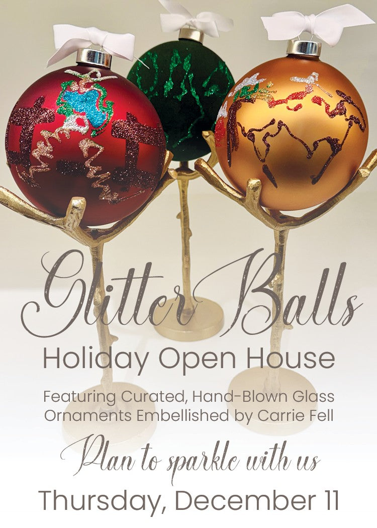 A special, limited collection of custom, hand-blown ornaments - artfully embellished by Carrie Fell - will be available, along with other goodies for those on your "nice list!"