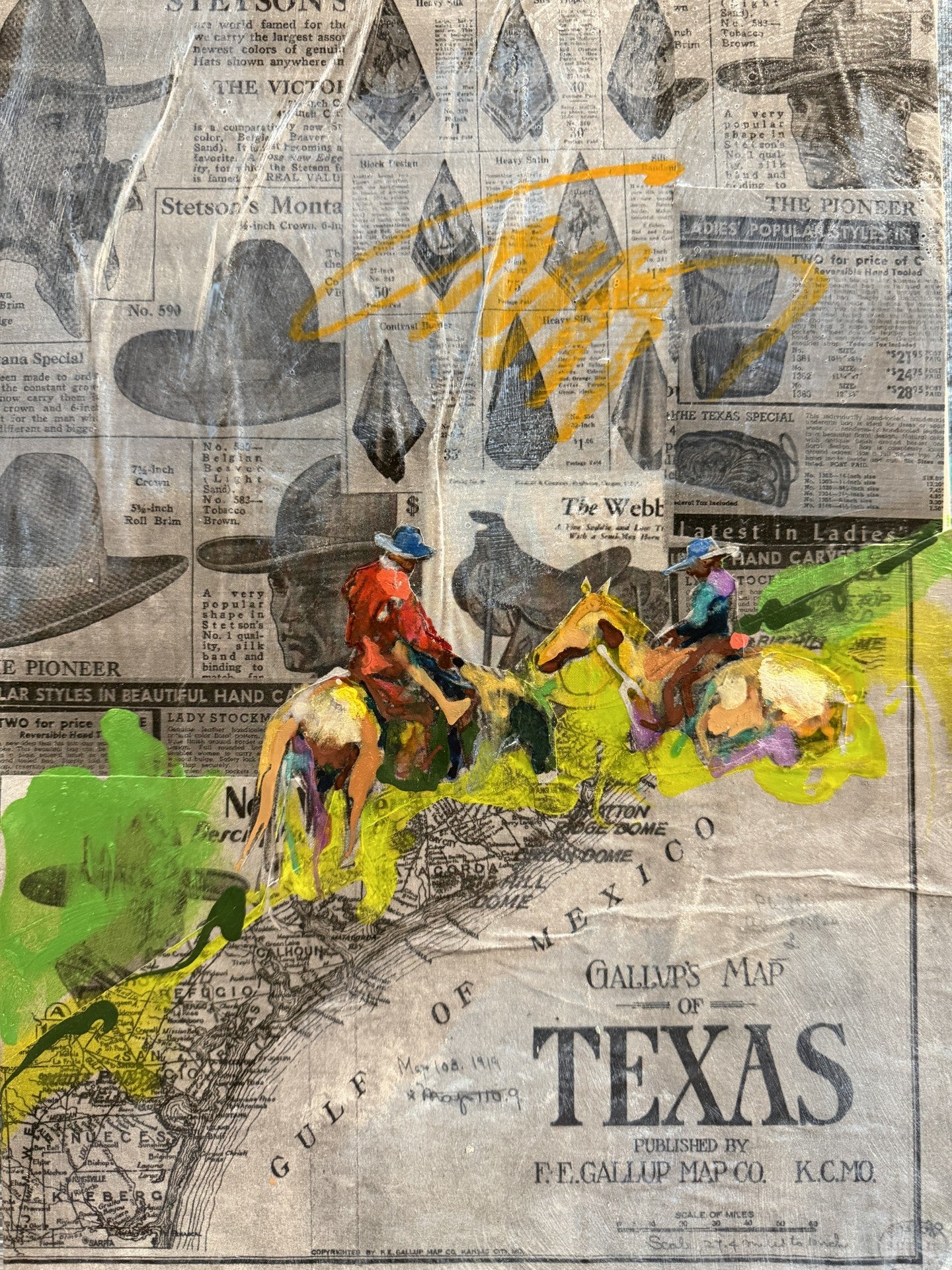 From the first collection in 2026, Unexplored Edges, comes this series of mixed-media on board, emphasizing the acrylic and oil details Carrie is best known for, set against a background of vintage Western advertising pieces. In a smaller format, Carrie's inimitable style, characterized by loose composition and precise scale, showcases all of her artistic talent in these remarkable works.
