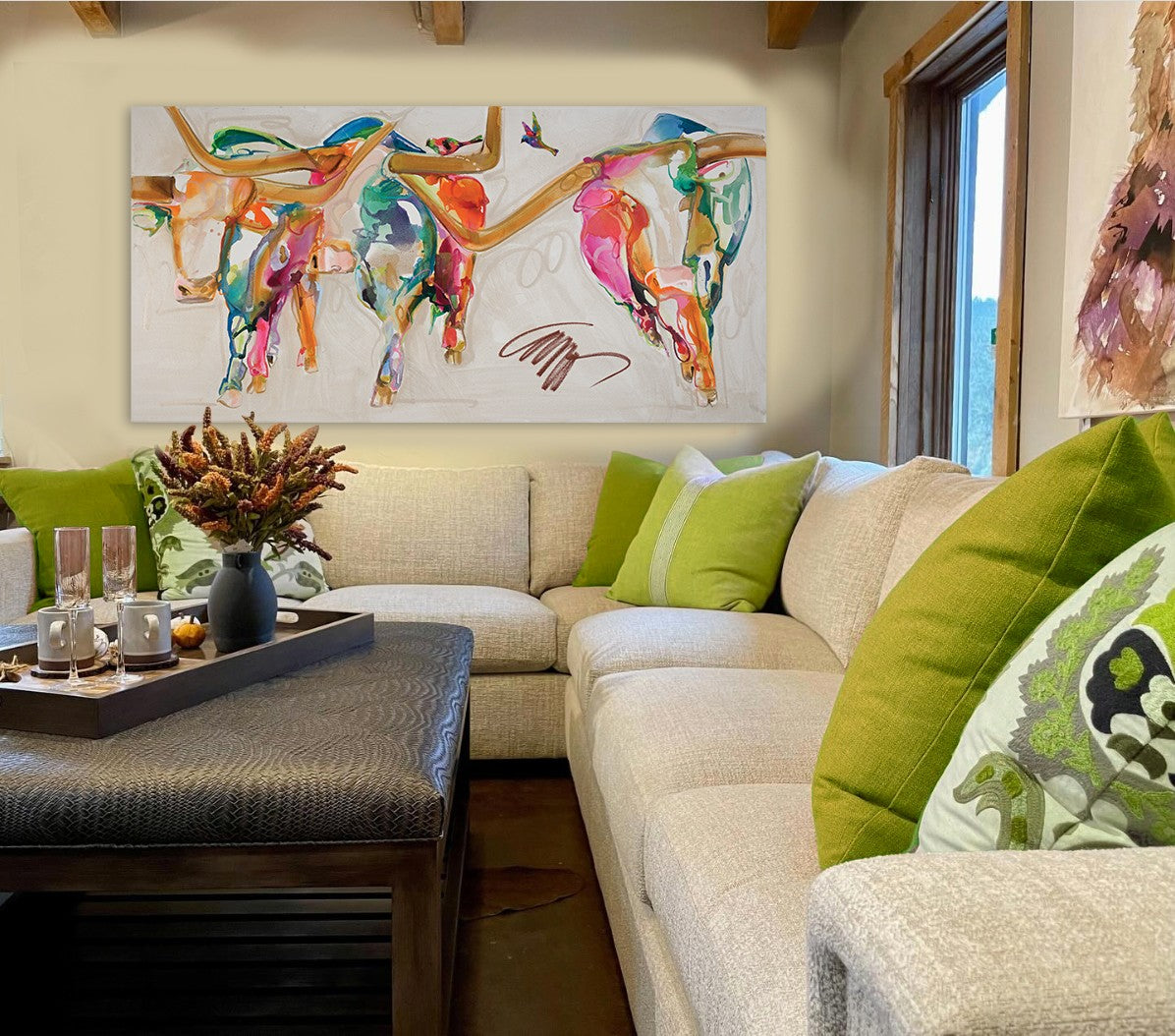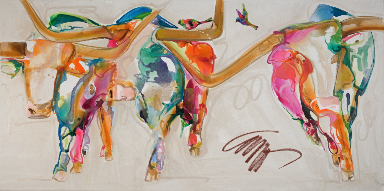 This masterpiece possesses an otherworldly grace, as if drifting on a gentle breeze. The longhorns, rendered in jewel-toned watercolors, shimmer against a pearlescent backdrop, creating an ethereal landscape... Beckoning you to choose the sanctuary ... Transforming space into a realm of wonder and exploration.