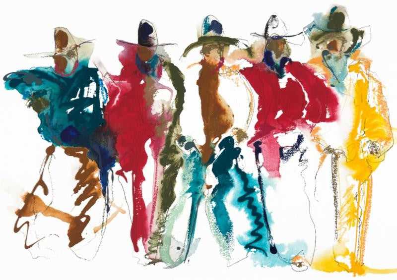 A terrific throwback piece that dates from over twenty years ago and pays homage to Carrie’s older style. The figures; loosely set against a stark white backdrop; showcases four standing buckaroos with wide chaps in a variety of yellows, browns, reds, and blues. A must-have for any collector yearning for a piece of days of yore!