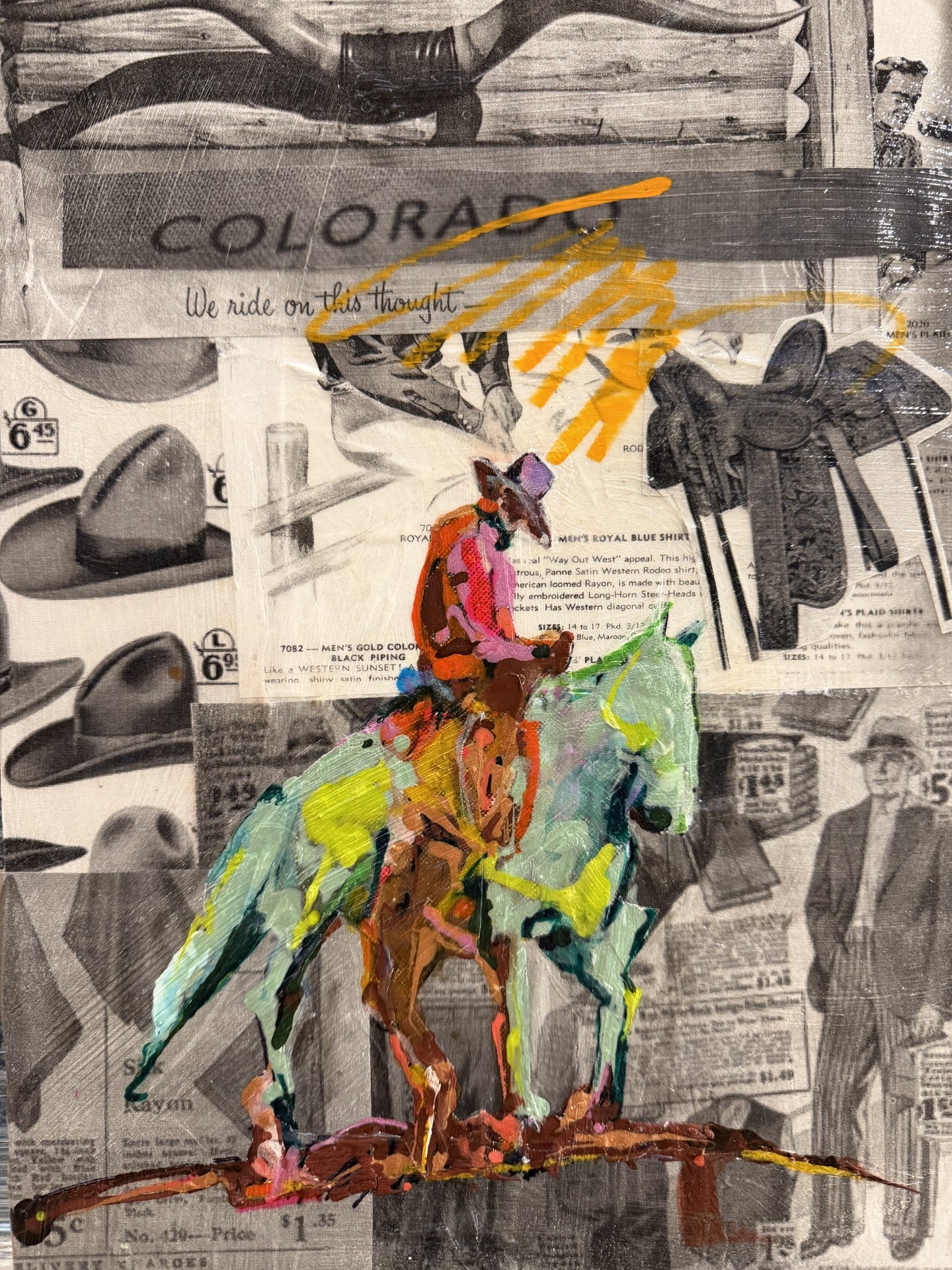 From the first collection in 2026, Unexplored Edges, comes this series of mixed media on board, emphasizing the acrylic and oil details Carrie is best known for, against a background of vintage Western advertising pieces. In a smaller format, Carrie's inimitable style, characterized by loose composition and precise scale, showcases all of her artistic talent in these remarkable works.